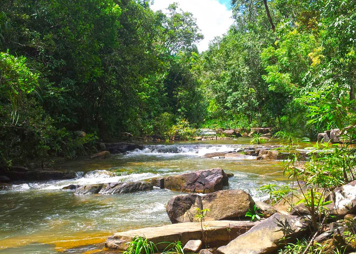 ឧទ្យានដងព្រែកស្ថិតនៅភូមិបត់ក្បាលដំរីឃុំម៉ាក់ប្រាង្គស្រុកទឹកឈូខេត្តកំពតនិងមានចម្ងាយប្រហែល 9 គីឡូម៉ែត្រពីរង្វង់មូលទុរេន។ទីនេះមានកន្លែងហែលទឹក ជិះទាទឹក ទស្សានាទេសភាពព្រៃភ្នំ ជិះខ្សែរ៉ក ជិះទូក ជិះទូកកាយ៉ាក ជិះកង់លើទឹក បោះជំរុំ លោតខ្សែពួរ ស្ទូចត្រី ញ៉ំអាហារ និង កន្លែងគេង ។ Dang Prek Park is situated approximately 9 kilometers from Duren Roundabout in Bot Kbal Damrey Village, Mak Prang Commune, Teuk Chhou District, Kampot Province. You could go camping, fishing, rope-jumping, and dining and can stay the night.